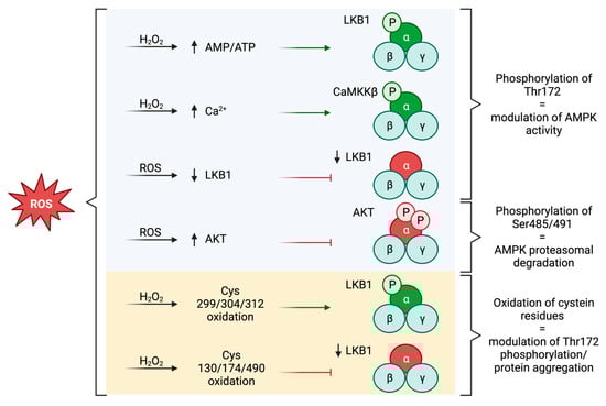 ROS-mediated regulation of AMPK. The indirect mechanisms of regulation of AMPK promoted by ROS are reported in the blue box. The yellow box represents the mechanisms by which ROS can directly affect AMPK activity. ROS affect AMPK activity mainly through the modulation of the α subunit, which is represented in green when the activity of the protein is promoted and in red when AMPK is inhibited by ROS. (Created with BioRender.com, accessed on 7 June 2023).