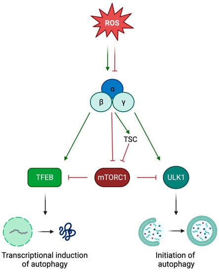 Whether ROS induce or repress the autophagic flux is still not clear and the results in different models are not always consistent, likely due to the fact that ROS may trigger cell-specific pathways and that, as mentioned before, the analysis of the effects mediated by different ROS is still lacking []. These discrepancies may also be determined by ROS concentrations. Accordingly, in SH-SY5Y cells, low concentrations of H2O2 were shown to promote TFEB activation and autophagy induction, while higher amounts of H2O2 caused TFEB repression and the inhibition of the autophagic flux []. These results might reflect the differences in the effects promoted by ROS on AMPK, which, as already emphasized, differ among experimental models and upon different conditions. These data highlight the need to better investigate how ROS impact on AMPK activity and, in turn, autophagy.