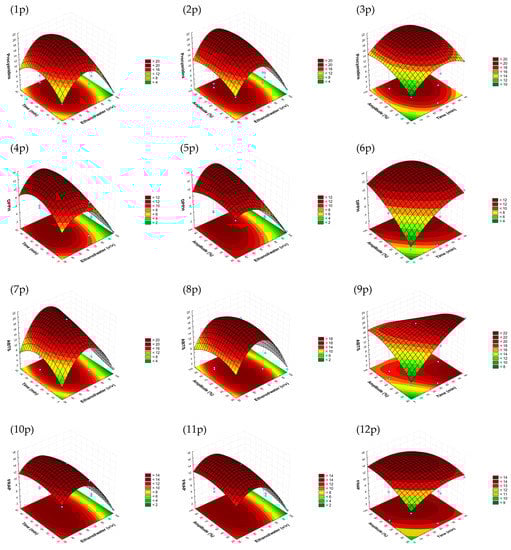 Response surface graphs (1p–12p) of the avocado peel sonotrode model that show the combined effects of the process variables: ethanol/water (v/v), time (min) and amplitude (%) for procyanidins (mg CE/g d.w.) and DPPH, as well as ABTS and FRAP antioxidant assays (mg TE/g d.w.).