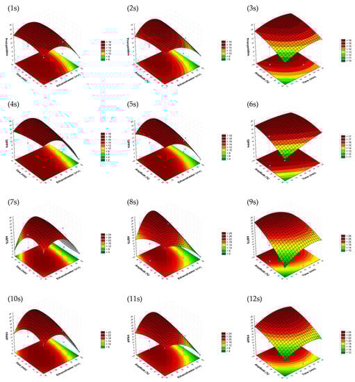Response surface graphs (1s–12s) of the avocado seed sonotrode model that show the combined effects of the process variables: ethanol/water (v/v), time (min) and amplitude (%) for procyanidins (mg CE/g d.w.) and DPPH, as well as ABTS and FRAP antioxidant assays (mg TE/g d.w.).