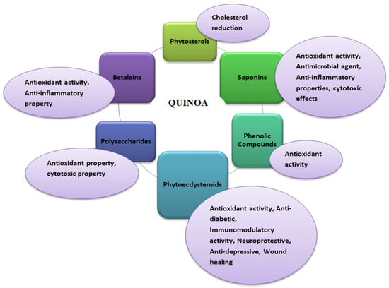 Quinoa is well known for its high nutritional content. In addition, it also possesses medicinal health benefits against different chronic diseases such as diabetes, obesity, anemia, and celiac disease [5,26]. These health benefits are due to certain phytochemicals that make quinoa superior to other grains in providing human health and wellness (Figure 1). Various bioactive compounds in quinoa provide medicinal properties, such as phytosterols, saponins, phenolic compounds, phytoecdysteroids, polysaccharides, and betalains [24,51]. Neumerous varieties of quinoa (white, red, and black) have been found to be rich in phenolic compounds, especially flavonoids, which benefit humans. Studies have proven that quinoa has not been seen to have toxicity [52]. Artificial intelligence or proteomics mining strategies can be potentially employed to identify novel protein perspective immuno-nutritional bioactivities [53]. In addition, the microbial pure or co-culture fermentation of quinoa seed’s therapeutic properties, such as antioxidant activity and antidiabetic influence, can potentially alter [54]. High concentrations of proanthocyanidins have been found in quinoa; these are oligomeric flavonoids with antioxidant, antidiabetic, anti-inflammatory, and anticancer properties [24,55,56]. The seed quality and composition of quinoa are highly varied under hyper-arid desert environments, and different locations of Canada’s growth conditions [57,58].