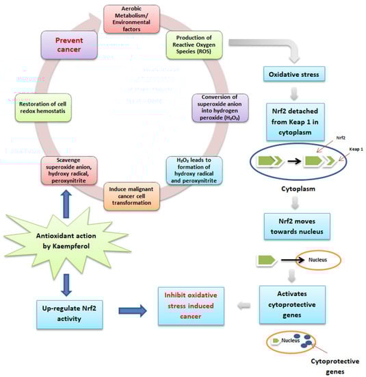 Phenolic antioxidants are in free and bound forms attached to the cell wall [63]. Kaempferol in quinoa seeds helps to prevent cancer, as described in Figure 3. Aerobic metabolism or environmental factors lead to byproducts, including reactive oxygen species (ROS), which possess carcinogenic properties by inducing cancer cell growth in the human body [64]. The superoxide anion, which is a member of ROS, is converted into hydrogen peroxide (H2O2) with the action of superoxide dismutase. Further, H2O2 is converted into hydroxy radical by reacting with reduced metals. In addition, when it reacts with nitric oxide, H2O2 also produces peroxynitrite, and all these formed products induce DNA damage and lead to carcinogenesis. Kaempferol has the potential to possess antioxidant as well as anti-inflammatory action to maintain cellular redox homeostasis by scavenging the superoxide anion, hydroxyl radical, and peroxynitrite, which can cause cancer in the human body [64]. Furthermore, during the ROS production leading to oxidative stress and cancer, Nrf2 (a leucine zipper transcription factor that protects the cells from oxidative stress) detached from Keap 1 (protein) and moved towards the nucleus to activate cytoprotective genes to inhibit the oxidative stress-induced cancer. However, under basal state, Keap 1 maintained the functioning of Nrf2 in the cytoplasm and dissociated it during the ubiquitin-proteasome pathway [65]. Therefore, kaempferol inhibits cancer generation by up-regulating the Nrf2 and Keap 1 cell defense pathways [64].