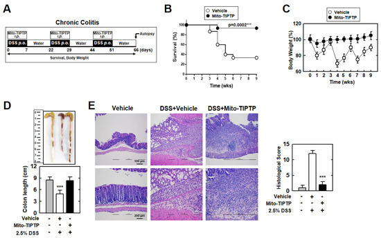 Mito−TIPTP alleviates chronic DSS−induced colitis in mice. (A) Schematic of the chronic colitis model treated 2.5% DSS with Mito−TIPTP (50 ng/kg). (B) The survival of mice was monitored for 9 weeks; mortality was measured for n = 15 mice per group. (C) Weight loss of vehicle or Mito−TIPTP in mice (n = 15). (D) Image (up) and length (down) of colon in 2.5% DSS−induced chronic colitis mice with vehicle or Mito−TIPTP. (E) Representative imaging of H&E staining of the colon (left) (n = 8). Histopathology scores were obtained from H&E staining were determined in 2.5% DSS−induced chronic colitis mice with vehicle or Mito−TIPTP. Scale bar, 100 μm. Statistical significance was determined by Student’s t−test with Bonferroni adjustment (*** p < 0.001) compared with vehicle.