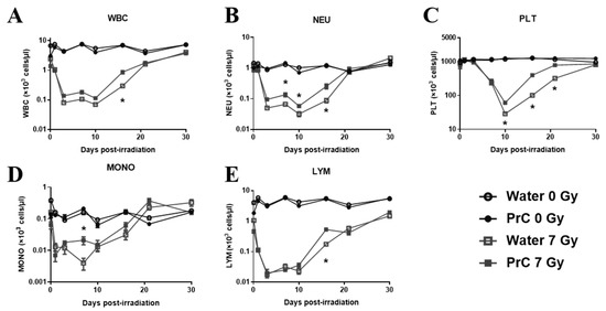 Recovery of peripheral blood cells following radiation injury. (A). white blood cells (WBCs), (B). neutrophils (NEU), (C). platelets (PLT), (D). monocytes (MONO), and (E). lymphocytes (LYM)). Day 0 represents 8 h post-irradiation. Non-irradiated mice treated with water (○) and PrC-210 (●) and irradiated (7 Gy) mice treated with water (□) and PrC-210 (■). Data shown are mean ± standard error of the mean (SEM) for n = 10 mice. Significant differences (p < 0.001–0.0125) between PrC-210-treated and water-treated irradiated groups by ANOVA are indicated with an asterisk (*). Some data points in the figure do not have error bars that are visible because they are smaller than symbols.