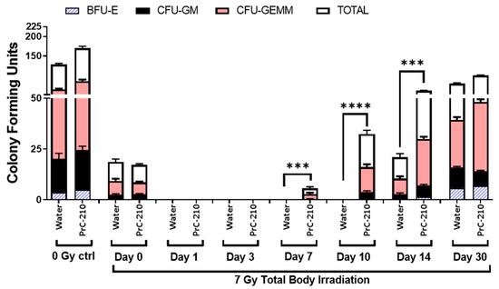 Hematopoietic progenitor cells are sensitive to radiation because they are vital due to their self-renewal and differentiation ability [23]. In addition to detrimental effects on peripheral blood cells, irradiation also negatively affects hematopoietic progenitor cells [23]. Clonogenic assays were carried out to evaluate the extent of damage caused by irradiation and possible recovery by PrC-210 treatment administered 24 h pre-TBI. Colony-forming unit (CFU) assays measured CFU-GM, CFU-GEMM, CFU-E, and BFU-E to evaluate the function of hematopoietic cells. As shown in Figure 4, no colonies were observed up to day 10 post-TBI at 7 Gy in the vehicle-treated group. However, colonies started growing on day seven post-TBI in the PrC-210 treated group, and numbers were significantly higher (p < 0.0001) on day 14 in the PrC-210 group compared to the control. Accelerated regeneration of bone marrow progenitor cells in the PrC-210 treated group indicated that the cellular functions affected by irradiation and hematopoietic injury that may cause lethality can be restored by PrC-210 pre-treatment.