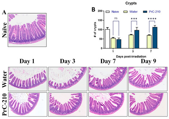 Histological evaluation of jejunum on days one, three, seven, and nine post-TBI. (A) H&E-stained representative sections of jejunum from naive, irradiated (9.75 Gy) water, and PrC-210-treated groups. Damage to villi due to radiation was observed by day three. (B) Viable crypts in all three groups were quantitated. Significant recovery in the PrC-210-treated group was observed when compared to the water-treated group on days three and seven by ANOVA (*** p ≤ 0.001, **** p ≤ 0.0001).