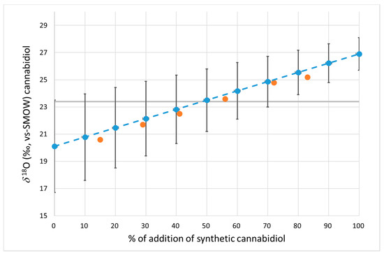 Variations in the δ18O values of natural CBD with the addition of biosynthetic CBD. The grey line defines the 95% threshold limit for authentic natural CBD. Blue dots: mean value. Bars: 95% confidence limit. Orange dots: measured values of the prepared mixtures.