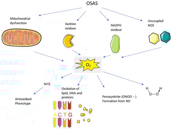 Mitochondria are intracellular organelles that have the function of nutrient metabolization and ATP production, and they are involved in energy metabolism, the generation of free radicals, calcium homeostasis, cell survival, and death [45]. They produce most of the energy of the body in the form of ATP through the Tricarboxylic acid cycle (TCA cycle) and the electron transport chain (ETC). Mitochondria are the major intracellular source of reactive oxygen species (ROS). The electron’s flow through the ETC is an imperfect process, that leads to an incomplete reduction in the oxygen by mitochondria and to the production of ROS [46]. ROS include free radicals, such as superoxide anion (O2•−) and hydroxyl radical (HO•), and non-radicals, such as hydrogen peroxide (H2O2) [47]. It has been shown that the interaction between hydroxyl radicals and DNA causes damage on multiple sites of the DNA itself [48]. ROS imbalance between the production and the level of antioxidant defense in the cell context drives oxidative stress. This oxidative stress causes damage to the mitochondria, leading to an interruption of its functions, such as the production of ATP [49]. There are several defense mechanisms with the aim to protect from oxidative stress which are included enzymatic molecules such as superoxide dismutase, catalase, glutathione reductase, glutathione peroxidase, and non-enzymatic molecules, such as vitamin E and C, glutathione, carotenoids, and flavonoids. Normally, the production of ROS remains in the mitochondria to protect the cells from oxidative damage. However, when the production of ROS overcomes the antioxidant defenses, oxidative stress causes irreversible ROS-mediated cellular damage to DNA, proteins, and lipids [50]. This mechanism damages the respiratory chain and causes mitochondrial dysfunction and leads to multiple pathological conditions like aging, metabolic disorders, and neurodegenerative pathologies. The role of mitochondria in recurrent hypoxia is not only evidenced in neuronal cells, but also in genioglossus and palatine muscles [51]. Mitochondria are the main producers of ROS during reoxygenation [52] (Figure 2). OSAS patients present a reduction in blood mitochondrial DNA levels, and it is a marker of mitochondrial damage [38]. Another source of ROS, during the reoxygenation phase, is the production of superoxide due to enzymes like xanthine oxidase, nitric oxide synthase, and NADPH oxidase [53]. ROS stimulates the expression of adhesion molecules, like L-selectin and integrins, and related endothelial adhesion molecules, like E-selectin, P-selectin, ICAM-1, and VECAM-1, which leads to microvascular damage [54,55]. The imbalance between increased ROS levels and ineffective antioxidant capacity can be quantified by multiple biomarkers, which are proteins generated by the oxidation of nucleic acids, proteins, and lipids [56,57,58,59].