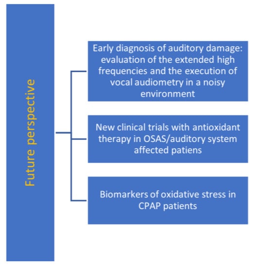 Antioxidants are molecules that inhibit ROS production and regulate oxidative stress. They can be endogenous, produced in vivo, and exogenous, taken from the outside. Endogenous antioxidants are the molecules we discussed early in this section. Exogenous antioxidants comprehend water and lipid-soluble molecules. Water-soluble antioxidants are methionine, vitamin C, carnitine, riboflavin, niacin, folic acid, polyphenols, and catechins. Methionine has the function to reduce cholesterol blood levels and to remove ROS [92]. Riboflavin and niacin eliminate lipid peroxides, with the aid of the GSH [93]. Vitamin C reduces toxicity by removing hydroxyl radicals [94]. Folic acid lowers homocysteine levels [95]. Lipid soluble antioxidants are β-carotene, vitamin E, astaxanthin, and coenzyme q10. Vitamin E gives stability to the biological membranes. Coenzyme q10 lowers the levels of vitamin E radicals after ROS removal [96]. There are some antioxidants that are both water and fat soluble, like Gingko Biloba and alpha lipoic acid. The latter has both antioxidant properties and restores the antioxidant ability of glutathione, vitamin A, vitamin E, and vitamin C [97]. It has been demonstrated that vitamins C and E are potential treatments of SNHL. In fact, it seems that vitamins improve hearing function in patients with sudden hearing loss [98]. It has been found, in an animal study, that vitamin E protects hair cells from the ototoxic damage of the cisplatin [99]. For what concerns OSAS patients, it has been shown that vitamin C and N-acetylcysteine reduce oxidative stress [58]. N-acetylcysteine reduces oxidative stress in OSAS patients by reducing peroxidized lipids and increasing glutathione. Furthermore, an improvement in PSG data has been found [86]. Vitamin C improves endothelial function in OSAS patients [100]. Lastly, it has been found that leptin, in OSAS patients, reduces free radicals, oxidative stress, and atherosclerosis [87]. It is clear that antioxidant therapy could be effective in OSAS and in SNHL due to problems like aging, ototoxic drugs, and noise exposure. However, in our review, no evidence of the effectiveness of antioxidant therapy in patients affected by OSAS and SNHL combined has been found (Figure 2).