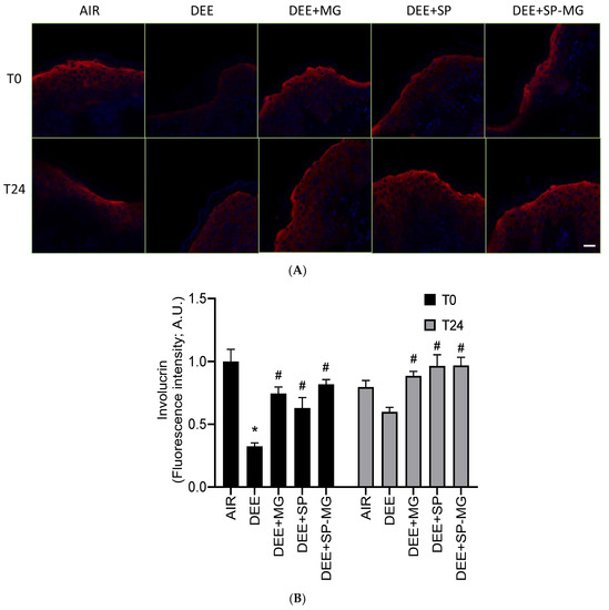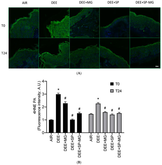 4.2. Investigation of Pollution-Induced Skin Inflammatory Responses with and without Topical Pretreatment with Gel Formulated with SP-MG Particles