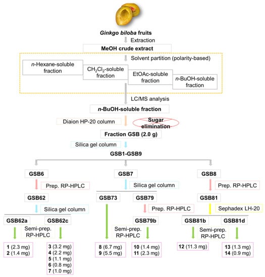 Fresh G. biloba fruits (4 kg) were crushed and then extracted twice using 100% MeOH (8.0 L) for 5 days at room temperature, and then the filtrate was concentrated under reduced pressure using a rotary evaporator to obtain the MeOH extract (425.2 g). The MeOH crude extract was suspended in distilled water (700 mL) then partitioned with hexane, dichloromethane (CH2Cl2), ethyl acetate (EtOAc), and n-BuOH three times (700 mL each). The organic phases were evaporated in a vacuum at up to 40 °C to yield the following four soluble fractions: hexane (8.2 g), CH2Cl2 (1.9 g), EtOAc (4.0 g), n-BuOH (28.8 g). With reference to a house-built UV library, the n-BuOH-soluble fraction presented the majority of phenolic compounds based on LC/MS analysis of the four fractions. One part of the n-BuOH-soluble fraction (GSB, 2.0 g), the portion without sugar, obtained by Diaion HP-20 column, was chromatographed on a silica gel column eluting with CH2Cl2/MeOH step gradients to yield nine fractions (GSB1–GSB9) obtained by combining the eluates based on TLC analysis. Fraction GSB6 (366.4 mg) was subjected by preparative reversed phase HPLC (prep. RP-HPLC) and eluted with a gradient solvent system of MeOH/H2O (40–100% MeOH) at a flow rate of 5 mL/min to afford three fractions (GSB61–GSB63). Fraction GSB62 (189.1 mg) was then subjected to column chromatography on silica gel eluted with CH2Cl2/MeOH step gradients to give six subfractions (GSB62a–GSB62f). GSB62a (88.3 mg) was further purified using semi-preparative reversed phase HPLC (semi-prep. RP-HPLC) with an isocratic solvent system of 27% MeOH/H2O at a flow rate of 2 mL/min to obtain compounds 1 (2.3 mg, purity = 91%) and 2 (1.4 mg, purity = 87%). Similarly, GSB62c (46.0 mg) was isolated using semi-prep. RP-HPLC with 30% MeOH/H2O to yield compounds 3 (3.2 mg, purity = 95%), 4 (2.2 mg, purity = 94%), 5 (1.1 mg, purity = 86%), 6 (0.8 mg, purity = 90%) and 7 (1.0 mg, purity = 92%). Fraction GSB7 (257.0 mg) was subjected to column chromatography on silica gel eluted with CH2Cl2/MeOH step gradients to obtain ten subfractions (GSB71–GSB79). Compounds 8 (6.7 mg, purity = 91%) and 9 (5.5 mg, purity = 92%) were separated from GSB73 (58.9 mg) using semi-prep. RP-HPLC with an isocratic solvent system of 15% MeOH/H2O at a flow rate of 2 mL/min. GSB79 (99.7 mg) was further fractionated by prep. RP-HPLC using a gradient solvent system of MeOH/H2O (30–80% MeOH, flow rate of 5 mL/min) to obtain four subfractions (GSB79a–GSB79d). Successfully, compounds 10 (1.4 mg, purity = 88%) and 11 (2.3 mg, purity = 91%) were yielded from GSB79b using the same semi-prep. RP-HPLC system with 18% MeOH/H2O. Fraction GSB8 (258.7 mg) was performed to prep. RP-HPLC and eluted with a gradient solvent system of MeOH/H2O (30–80% MeOH) at a flow rate of 5 mL/min to afford four fractions (GSB81–GSB84). Of these, GSB81 was further submitted to Sephadex LH-20 column chromatography and obtained four subfractions (GSB81a–GSB81d). GSB81b (67.1 mg) was further purified by semi-prep. RP-HPLC with 35% MeOH/H2O to afford compound 12 (11.3 mg, purity = 90%). Lastly, compounds 13 (1.3 mg, purity = 88%) and 14 (0.9 mg, purity = 90%) were isolated from GSB81d (43.6 mg) using semi-prep. RP-HPLC with 35% MeOH/H2O.