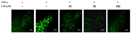 To observe the effects of L3R on TNF-α-induced intercellular ROS generation, we conducted a DCFDA staining assay. As depicted in Figure 5, L3R exhibited an inhibitory effect on ROS generation in the TNF-α-treated groups. These findings further supported the results of L3R obtained from the intracellular ROS generation assay, as shown in Figure 4.