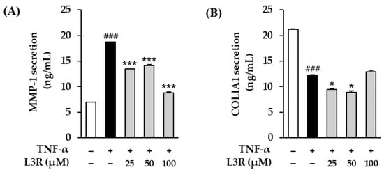 Pro-inflammatory cytokines cause chronic diseases, such as psoriasis, that destroy alpha hydroxy acids in the ECM and acclerate skin aging [55]. Therefore, we evaluated the effects of L3R on IL-6 and IL-8 secretion in TNF-α-treated NHDFs. Compared to the control group, a treatment of 20 ng/mL TNF-α increased IL-6 secretion to 7.57 ± 0.14 ng/mL (p < 0.001). In contrast, 50 and 100 µM of L3R treatment decreased it to 5.88 ± 0.47 (p < 0.05) and 4.32 ± 0.00 (p < 0.001), respectively (Figure 8). In IL-8 secretion, TNF-α treatment significantly increased IL-8 secertion to 12.04 ± 0.19 ng/mL (p < 0.001). However, 25, 50, and 100 µM of L3R treatment attenuated it to 4.03 ± 0.03 (p < 0.001), 3.38 ± 0.06 (p < 0.001), and 6.23 ± 0.49 ng/mL (p < 0.001), respectively.