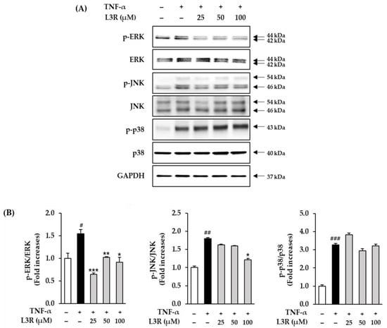 Effect of L3R on TNF-α-induced protein expression associated with inhibition of mitogen-activated protein kinases (MAPKs) phosphorylation in normal human dermal fibroblasts (NHDFs). (A) Cells were treated with 25, 50, and 100 µM L3R for 1 h and then exposed to 20 ng/mL TNF-α for 15 min. The phosphorylated bands were analyzed by immunoblotting for phospho-ERK, ERK, phospho-JNK, JNK, phospho -p38, p38, and GAPDH. (B) The graphs show the fold-increase in the phosphorylation of MAPKs compared to the untreated group. Data are presented as mean ± SEM (n = 3). # p < 0.05, ## p < 0.01, and ### p < 0.001 compared with the control group and * p < 0.05, ** p < 0.01, and *** p < 0.001 compared with the TNF-α-treated group.