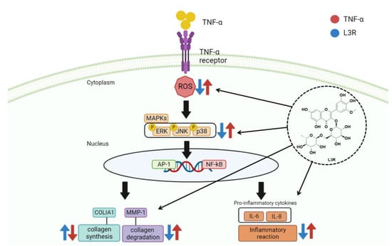 As pro-inflammatory factors cause diverse inflammatory reactions that lead to chronic diseases [77], we investigated the effect of L3R on pro-inflammatory cytokine secretion in TNF-α-stimulated NHDFs. Figure 8 indicates that L3R has an inhibitory effect on proinflammatory factors in TNF-α-induced NHDFs. Flavonoids have been widely reported to exhibit suppressive effects on pro-inflammatory cytokines through the modulation of MAPKs/AP-1 or NF-κB signaling pathways in human skin cells. For instance, catechin has been shown to inhibit ROS generation and reduce levels of MMP-1 and pro-inflammatory cytokines. Furthermore, catechin has been found to increase the secretion of pro-collagen type 1 through MAPKs/AP-1 and NF-κB pathways in TNF-α-induced HDFs [78]. Similarly, fisetin has been demonstrated to ameliorate ROS generation, MMPs (MMP-1, 3, 9), and pro-inflammatory cytokines through the inhibition of MAPKs and NF-κB signaling in UVB-induced human foreskin fibroblasts (HS68) [79]. The aforementioned studies provide support for the hypothesis that L3R can effectively ameliorate ROS generation and inhibit MMP-1 secretion through the suppression of ERK phosphorylation.