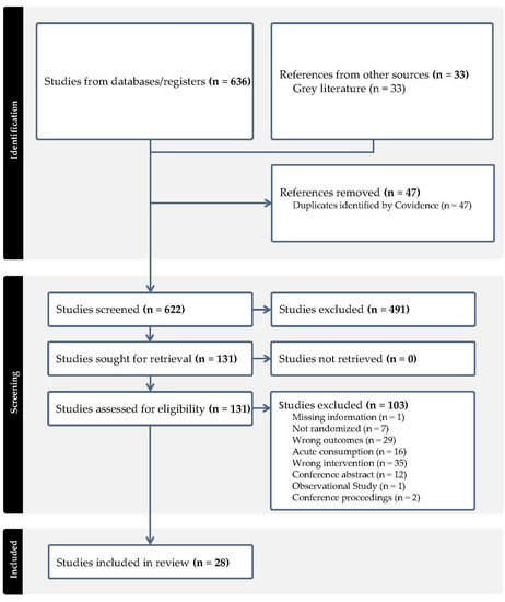 The literature search identified 636 studies that were imported from screening. Out of these, 47 study duplicates were removed and 622 studies were screened, with 491 studies determined to be irrelevant. Ultimately, 131 full-text studies were assessed for eligibility, with 103 out of the 131 studies excluded primarily due to the wrong intervention unrelated to berries. A total of 28 RCTs met the eligibility criteria [29,30,31,32,33,34,35,36,37,38,39,40,41,42,43,44,45,46,47,48,49,50,51,52,53,54,55,56]. The study flow diagram is shown in Figure 1 (PRISMA).