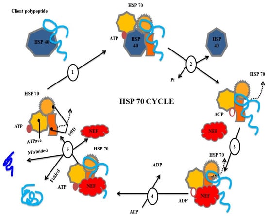 The heat shock protein family, such as HSP70, are primarily studied for disease control purposes, but other members, such as small heat shock proteins (sHSPs), including HSP60 and HSP90, alongside HSP40/co-chaperone, have shown potential in treating pathogen infections. sHSPs act as oligomeric platforms, binding structurally perturbed proteins without requiring ATP, thereby preventing their irreversible denaturation under cellular stress. HSP90, HSP70, and HSP60 are stress-induced and provide protection against irreversible protein denaturation. However, their primary function involves binding and folding newly synthesized proteins through allosteric rearrangement, which is driven by ATP, although the mechanisms of action and the molecular structure differ among the chaperone families. In cooperation, these HSPs form intracellular networks with accessory proteins and other co-chaperones. sHSP monomers are a group of conserved α-crystallin domains flanked by carboxyl- and amino-terminal sequences and assemble into oligomers. The α-crystallin domain facilitates monomer dimerization and substrate binding, with the efficiency depending on the terminal region. During stress, sHSP oligomers may undergo structural rearrangement or disassemble, which promotes substrate protein interactions and increases surface hydrophobicity. Upon stress resolution, proteins released from sHSPs have the ability to spontaneously refold with the assistance of HSP70, which is an ATP-dependent HSP [189]. The key role of sHSPs is to prevent protein denaturation, which is irreversible during infection and stress.