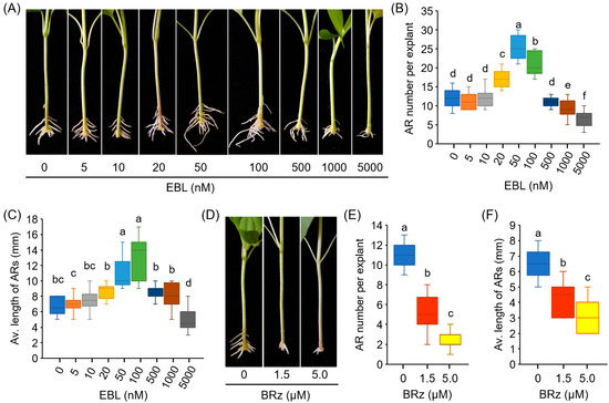 EBL promotes AR formation in the hypocotyls of pepper explants. (A–C) Effects of EBL on AR formation of pepper. Pepper explants with primary root excision were treated with EBL at different concentrations (0–5000 nM) for 10 days, followed by photographing (A), counting of AR number (B), and determination of AR average length (C). (D–F) Effects of BRz on AR formation of pepper. Pepper explants were treated with BRz at concentrations of 1.5 and 5.0 μM for 10 days. Each treatment has 15 pepper explants. Different lowercase letters indicate that the values were significantly different among different treatments (p < 0.05).