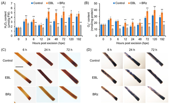 During AR formation, H2O2 contents in the rooting zone increased slightly at 3 h and 6 h, and then, at 24 h, the rate of H2O2 production increased sharply. In the EBL-treated hypocotyls, the amounts of H2O2 were much more prevalent than in the control explants, while in the BRz-treated explants, the H2O2 accumulation after 24 h was significantly repressed (Figure 2A). For O2•−, the accumulation pattern in the control explants was similar to H2O2, but EBL treatment enhanced O2•− accumulation after 72 h in the rooting zone (Figure 2B). Again, BRz was effective in repressing O2•− accumulation (Figure 2B). EBL-induced and BRz-repressed accumulation of H2O2 and O2•−, detected in situ by DAB and NBT staining, respectively, were also observed clearly in the AR zone (Figure 2C,D).