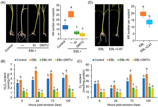 Involvement of ROS in EBL-promoted AR formation in pepper explants. (A) Effects of KI and DMTU on EBL-induced AR formation. Once primary roots were cut, pepper explants were used for AR formation in water without (Control) or with EBL (50 nM), EBL + KI (0.5 mM), or EBL + DMTU (2 mM) for 10 days, followed by photographing phenotype and counting AR number. KI and DMTU were used as ROS scavengers. KI, potassium iodide; DMTU, N,N’-Dimethylthiourea. (B,C) Contents of H2O2 (B) and O2•− (C) in the AR zone of pepper explants treated with EBL, EBL + KI, or EBL + DMTU for 6, 24, 48, and 120 h. (D) Effects of CAT on EBL-induced AR formation. AR formation in pepper explants treated with EBL (50 nM) or EBL + CAT (200 unit/mg) for 10 days, followed by photographing phenotype and counting AR number. Each treatment has 15 pepper explants. Different lowercase letters indicated that the values were significantly different among different treatments (p < 0.05).