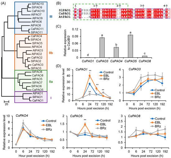 Phylogenetic analysis of CaPAO family and EBL-induced expression of CaPAOs during AR formation in pepper explants: (A) Neighbor-joining phylogenetic tree of the CaPAO, AtPAO, and SlPAO proteins. The accession numbers for these proteins are listed in Table S1. (B) The secretory signal peptide in the N-terminal of CaPAO1 and SlPAO1 proteins. The green dashed square indicates the secretory signal peptide. Invariant residues are shaded in blue boxes, with residues that are conserved colored red, and variable residues shown in black. (C) Expression levels of CaPAO genes in the base of pepper hypocotyls before AR formation. The expression level of each CaPAO gene was normalized to CaUBI3 expression. (D) Effects of EBL and BRz on the expression of CaPAO genes during AR formation. The expression level at 0 h was normalized to 1.0. Each treatment contains three biological replicates, and each replicate has 15 explants. Different lowercase letters in (C) indicate that the mean values of three replicates are significantly different among different genes (p < 0.05). Two asterisks (**) in (D) indicate significant differences between control and EBL or BRz treatment at p < 0.01.