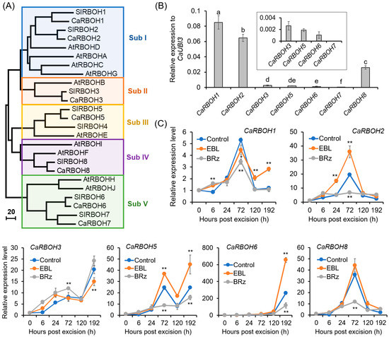The temporal changes in the expression levels of CaRBOHs during AR formation and their expression patterns in response to EBL and BRz treatments are shown in Figure 6C. The expression of CaRBOH1, CaRBOH2, and CaRBOH8 started to increase at 24 h, peaked at 72 h, and then declined. Of them, CaRBOH2 showed a 1.84-fold increase after EBL treatment at 72 h, but significantly decreased in BRz-treated explants compared with the control. For CaRBOH3 and CaRBOH6, their expression increased gradually, and at 192 h, a 20.31- and 262.46-fold increase was detected, respectively. EBL could induce and BRz could repress the expression of CaRBOH6. For CaRBOH5, its expression showed a substantial increase at both 72 and 192 h, and a significant induction was observed after EBL treatment. Combining these results, these results suggest that CaRBOH2 might be involved in EBL-induced AR initiation, CaRBOH6 might be involved in EBL-induced AR elongation, and CaRBOH5 might be involved in EBL-induced AR initiation and elongation.