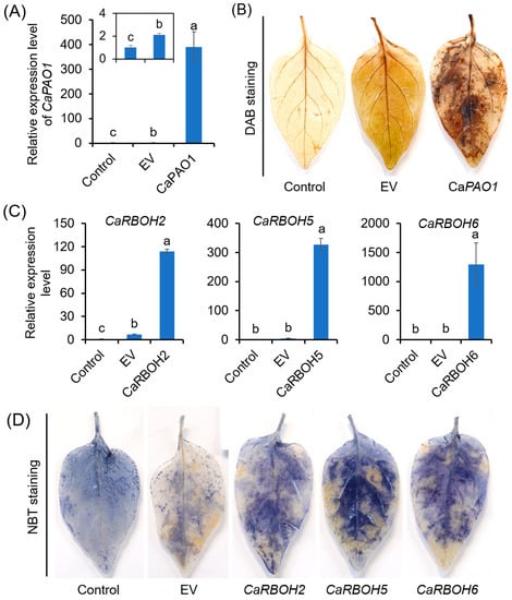 The capabilities of CaPAO1, CaRBOH2, CaRBOH5, and CaRBOH6 in ROS production were evaluated using transient expression analysis (Figure 7). DAB staining suggested that pepper leaves expressing CaPAO1 showed a higher H2O2 level than the control and empty vector control (EV) (Figure 7A,B). Likewise, we found that pepper leaves with expression of CaRBOH2, CaRBOH5, and CaRBOH6 showed a remarkable increase in O2•−, detected with NBT staining (Figure 7C,D). These results confirm the ability of CaPAO1 in H2O2 generation, and the capacity of CaRBOH2, CaRBOH5, and CaRBOH6 in O2•− production.