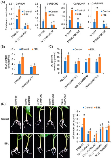 Compared with the TRV2:00 control explants, AR formation was significantly repressed in the TRV2: CaPAO1 and TRV2: CaRBOH2 explants, both with and without EBL application (Figure 8C,D). For the TRV2:CaRBOH5 and TRV2:CaRBOH6 explants, although the AR formation capacity was not significantly reduced without EBL treatment, the promoting effects of EBL on AR formation were significantly abrogated (Figure 8C,D). These results confirmed the function of CaPAO1, CaRBOH2, CaRBOH5, and CaRBOH6 in EBL-induced AR formation in pepper.