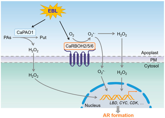 Schematic model for EBL-induced AR formation by coordinating ROS generation in pepper. EBL induces CaPAO1-derived H2O2 generation and CaRBOH2/5/6-derived O2•− generation in apoplasts. O2•− and H2O2 trigger signaling transduction to regulate the expression of CaLBD, CaCYC, and CaCDK genes, and further stimulate AR formation. PAs, polyamines. Put, putrescine. PM, plasma membrane.