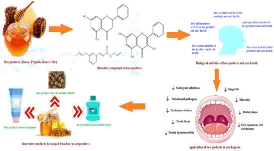 According to a report, oral diseases are becoming a matter of concern globally [22]. Oral health, in turn, affects the systemic health. An increased risk of cardiovascular diseases, digestive problems, diabetes and bacterial pneumonia has been reported in patients with poor oral health [23]. Various studies have explained the unique bioactive components of honey bee products that confer therapeutic and medicinal properties and improve the overall health. The bioactive compounds found in honey, propolis and royal jelly are known to possess antioxidant, anti-microbial, anti-inflammatory, anti-cancer, anti-ulcer, immunomodulatory, neuromodulatory and metabolic syndrome preventing activities [24,25,26,27,28,29,30,31,32,33,34,35,36]. Due to these properties, these products are being used/or show wide applications in preventing oral diseases like stomatitis, mouth ulcers, dental caries, plaque, gingivitis, periodontitis, cavity infection, dentin hypersensitivity, oral cancer, malodor and mucositis [15,37,38,39,40].