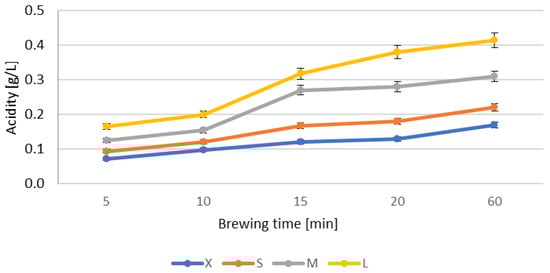 A similar trend (logarithmic increase with increasing brewing time and increasing weight) is also observed for acidity (Figure 2). In test X, these values increase from 0.07 to 0.17 g/L, in test S from 0.09 to 0.22 g/L, in M—from 0.12 to 0.31 g/L and in L—from 0.17 to 0.41 g/L.