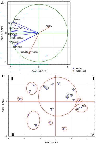 PCA show that the first two components account for 91.88% of the total variance (Figure 3A). The strongest correlation is found between the content of polyphenols in the water fraction (0.97) and methanol fraction (0.96), DPPH (0.95) and TEAC in the water fraction (0.95), while the lowest correlation is found for the soluble dry matter content (0.61) and acidity (0.16). In addition, vectors indicating acidity and soluble dry matter content indicate a strong negative correlation between these variables. The analysis allows the distribution of the trials in the quadrants of the two-factor case coordinate plot (Figure 3B). The trials that make up the one-piece sets in quadrant I are X5. This sample is distinguished by its low acidity. In quarter II, a separate group is formed by L60, L20 and S15, which are connected by high DPPH, TEAC of the water fraction and the content of polyphenols and FRAP of the methanol fraction. Quarter III samples contain a higher content of polyphenols and FRAP of water fraction, FRAP and TEAC of methanol fraction, and extract content than other cases. A separate group in this quarter are M15, L5 and M10. It is worth noting that in this quarter, the vast majority of samples belong to samples with a 5 g weight (M). Quadrant IV says about the lack of significant correlations with respect to antioxidant activity but shows strongly positively correlated variables represented by S20 and M10. It is worth noting that such parameters as the soluble dry matter content or the amount of polyphenols in the water fraction are the components determining the selection of the most desirable infusion. In this case, the M15 and L5 trials are at the forefront.