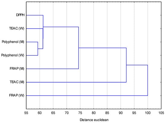Hierarchical method of agglomeration of clusters of the tested samples in relation to the antioxidant activity (total polyphenol content of the water (W) and methanol (M) fractions, DPPH, FRAP of the water (W) and methanol (M) fractions and TEAC of the water (W) and methanol (M) fractions). Cluster analysis is expressed in Euclidean distance [binding distance/maximum distance × 100].