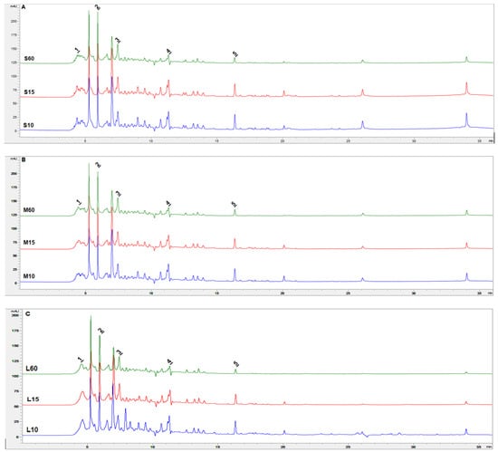 HPLC profile of infusions from dried Ginkgo biloba leaves in selected samples ((A)—samples with 2.5 g weight—S, brewing time 10, 15 and 60 min; (B)—samples with 5.0 g weight—M, brewing time 10, 15 and 60 min; (C)—samples with 7.5 g weight—L, brewing time 10, 15 and 60 min). All samples were determined—(1) chlorogenic acid; (2) epicatechin; (3) catechin; (4) coumarin; and (5) apigenin—with detection at 280 nm.