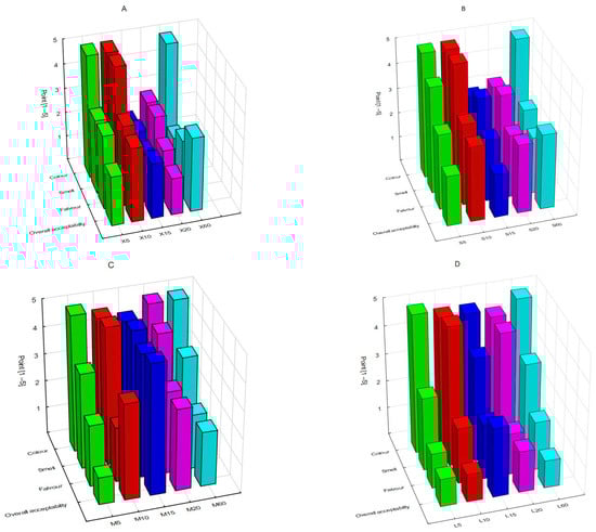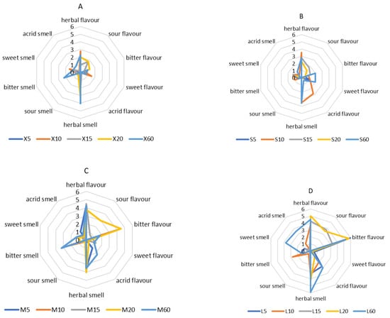 Sensory profile of smell and flavour of samples X—the smallest weight (A), S—small weight (B), M—medium weight (C) and L—large weight (D) for attributes such as herbal, acrid, sweet, bitter and sour. For the clarity of the graphs, the scale has been limited to six.
