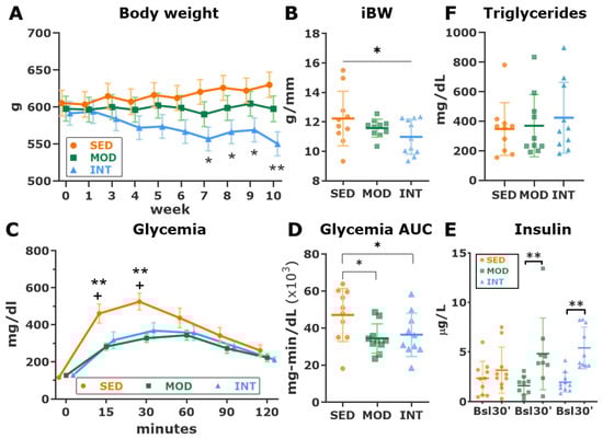 Impact of different loads of regular training on cardiovascular risk factors. (A) Weekly measurement (estimated marginal mean ± standard error of the mean {SEM}) of body weight. Analysis with linear mixed modeling with a repeated measures covariance structure, including week, group, and its interaction as predictors. The time point × group interaction was significant at the p < 0.001 level; within each week, significant post hoc pairwise comparisons between groups (LSD tests) are shown. N = 10 per group. * p < 0.05, ** p < 0.01 INT vs. Sed (B) Indexed body weight (BW) before euthanasia. Analysis with a linear trend analysis. * p < 0.05. (C) Results (estimated marginal mean ± SEM) of the intraperitoneal glucose tolerance test. Analysis with linear mixed modeling with a repeated measures covariance structure, including time point, group, and its interaction as predictors. The time point × group interaction was significant at the p < 0.001 level; within each time point, significant post hoc pairwise comparisons between groups (LSD tests) are shown. N = 10 per group. ** p < 0.01 SED vs MOD; + p < 0.05 SED vs INT. (D) Area under the curve (AUC, mean ± SD) of glucose blood concentrations during the glucose test. Analysis was performed with a one-way ANOVA which showed a significant omnibus test at the p < 0.05 level. Significant pairwise LSD tests are shown. * p < 0.05. (E) Serum insulin concentration (mean ± SD) before and 30 min after glucose administration. Analysis with linear mixed modeling with a repeated measures covariance structure, including time point (i.e., baseline and 30 min) and group and its interaction as predictors. The interaction time point × group was significant at the p < 0.05 level; within each group, significant post hoc pairwise comparisons between time points (baseline vs. 30-min, LSD tests) are shown. ** p < 0.01. (F) Triglyceride plasma concentration (mean ± SD) in all groups. Analysis was performed with a one-way ANOVA. SED, MOD, and INT (obese sedentary, moderately and intensively trained rats, respectively).