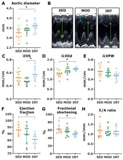 Echocardiographic changes produced by exercise. (A) Ascending aortic diameter (mean ± SD). Analysis with a linear trend analysis. (B) Representative M-mode images of a parasternal long-axis view. The segmented blue line identifies the interventricular septum (IVS) and the green arrow identifies the left ventricular diastolic diameters (LVDd). (C–H) The mean ± SD is shown for indexed IVS (iIVS) (C), indexed LVDd (iLVDd) (D), indexed left ventricle posterior wall (iLVPW) (E), left ventricle ejection fraction (F) and fractional shortening (G), and transmitral E/A ratio (H). All analyses were performed with a one-way ANOVA which showed a significant omnibus test at the p < 0.05 level for iVS, iLVDd, ejection fraction, and fractional shortening. Post hoc pairwise comparisons were performed with the LSD tests. * p < 0.05. SED, MOD, and INT (obese sedentary, moderately and intensively trained rats, respectively).
