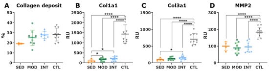 Aortic collagen deposition and turnover. (A) Percentage of collagen deposit in the tunica media from picrosirius red-stained thoracic aorta (mean ± SD). (B–D) Aortic mRNA expression (mean ± SD) of alpha-1 procollagen types 1 (B) and 3 (C), and matrix metalloproteinase-2. Analyses were performed with one-way ANOVA which showed a significant omnibus test at the p < 0.0001 level for gene expression parameters. Post hoc pairwise comparisons (t-tests) were FDR-adjusted. * p < 0.05; **** p < 0.0001. SED, MOD, and INT (obese sedentary, moderately, and intensively trained rats, respectively), CTL (young lean rats).