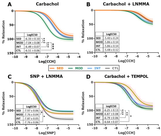Relaxation response in vascular reactivity experiments in descending thoracic aorta. Dose-response relaxation curves induced by carbachol (CCH) alone (A) and in the presence of nitric oxide inhibitor LNMMA (B), sodium nitroprusside (SNP) in the presence of L-NMMA (C), and carbachol in the presence of the free radical scavenger TEMPOL (D). Shaded areas of all curves represent 95% CI. The estimated logEC50 (mean ± SEM) for each group and curve is shown in the inset. Analyses were performed with a one-way ANOVA per each individual graph, comparing fitted logEC50 in three parameter equations. Significant post hoc pairwise FDR-adjusted comparisons between groups are shown, * p < 0.05, ** p < 0.01, and *** p < 0.001. SED, MOD, and INT (obese sedentary, moderately, and intensively trained rats, respectively), CTL (young lean rats). For all experiments: n = 9 (SED), n = 10 (MOD), n = 10 (INT, except for panel 4C in which n = 9), and n = 8 (CTL).