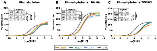 Contractile response in vascular reactivity experiments in descending thoracic aorta. Dose-response contraction curves induced by phenylephrine (PHE) alone (A) and in the presence of the nitric oxide inhibitor L-NMMA (B) or the free radical scavenger TEMPOL (C). Shaded areas of all curves represent 95% CI. Estimated LogEC50 (mean ± SEM) for each group and curve is shown. Analyses were performed with a one-way ANOVA per each individual graph, comparing fitted logEC50 in three parameter equations. Significant post hoc pairwise FDR-adjusted comparisons between groups are shown, * p < 0.05, ** p < 0.01, *** p < 0.001, and **** p < 0.0001. SED, MOD, and INT (obese sedentary, moderately, and intensively trained rats, respectively), CTL (young lean rats). For all experiments: n = 6 (SED, except for panel (C) in which n = 5), n = 11 (MOD), n = 9 (INT), and n = 8 (CTL).