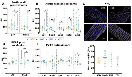 To further investigate the role of oxidative stress in vascular function, the mRNA expression of oxidative stress-related markers was evaluated in the aortic wall. Compared with lean animals, intensively trained rats presented with an increased expression of pro-oxidant Nox2, while both exercised groups showed an increased expression of P47 (Figure 6A). These findings were accompanied by a higher expression of antioxidant markers (Cat, Sod2, Gpx1, Nrf2, and Gch1) in the trained groups (Figure 6B). NRF nuclear translocation was analyzed in aortic histological sections by immunofluorescence and yielded no differences between groups (Figure 6C). We next focused on perivascular adipose tissue (PVAT), which has been shown to play an important regulatory role in vascular function. Higher expression of the pro-oxidant marker Nox2 was found in INT rats (Figure 6D) than in MOD rats. Moreover, INT rats expressed lower levels of the antioxidant markers Gch1 and Sod2 (Figure 6E).