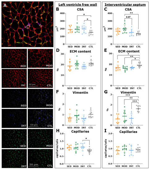 Left ventricular myocardial histological assessment. (A) Representative triple immunofluorescence images of myocardial triple immunofluorescence (wheat germ agglutinin in red for extracellular matrix, vimentin in blue for fibroblasts, and isolectin-GS IB4 in green for capillaries). Results (mean ± SD) for the left ventricular (LV) myocyte cross-sectional area (CSA) in the LV free wall and the interventricular septum (IVS) ((B,C), respectively), extracellular matrix content in the LV free wall and the IVS (D,E), vimentin-positive area in the LV free wall and the IVS (F,G), and capillary density in the LV free wall and the IVS (H,I). Analyses were performed with a one-way ANOVA, and significant post hoc pairwise FDR-adjusted comparisons between groups are shown, * p < 0.05, ** p < 0.01, and *** p < 0.001. SED, MOD, and INT (obese sedentary, moderately, and intensively trained rats, respectively), CTL (young lean rats).