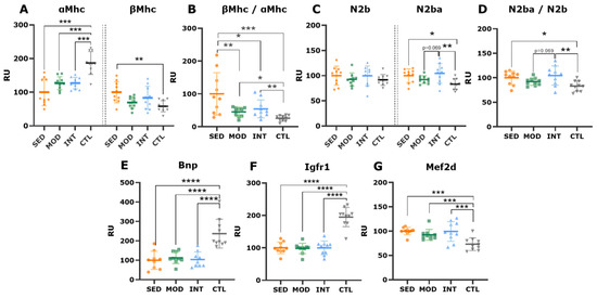 Expression of genes involved in cardiac remodeling in all groups. Interventricular septum mRNA expression (mean ± SD) of the α- and β-myosin heavy chain isoforms (Mhc) (A) and their ratio (B), titin isoforms N2b and N2ba (C), and their ratio (D), Bnp (E), Igfr1 (F), and Mef2d (G). Analyses were performed at the gene level with a one-way ANOVA, significant post hoc pairwise FDR-adjusted comparisons between groups are shown, * p < 0.05, ** p < 0.01, *** p < 0.001, and **** p < 0.0001. SED, MOD, and INT (obese sedentary, moderately, and intensively trained rats, respectively), CTL (young lean rats).