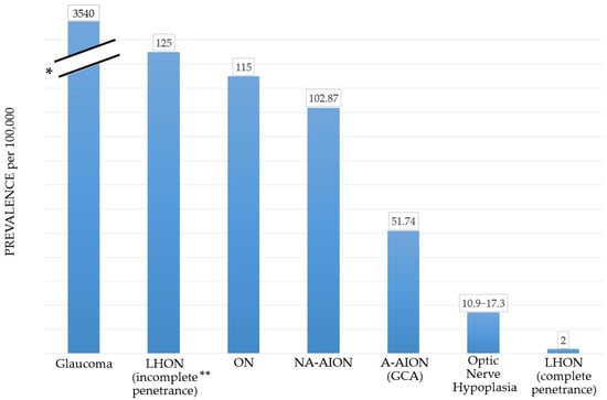 Figure 1. Prevalence (per 100,000) in some of the most frequent optic neuropathies. LHON: Leber’s hereditary optic neuropathy; ON: optic neuritis; NA-AION: nonarteritic anterior ischemic optic neuropathy; A-AION: arteritic anterior ischemic optic neuropathy; GCA: giant cell arteritis. * We used a y-axis break in consideration of the remarkably higher prevalence of glaucoma compared to all other optic nerve disorders. ** LHON prevalence in case of incomplete penetrance is meaningfully higher than in complete penetrance due to the high frequency of the variant mutant carriers.