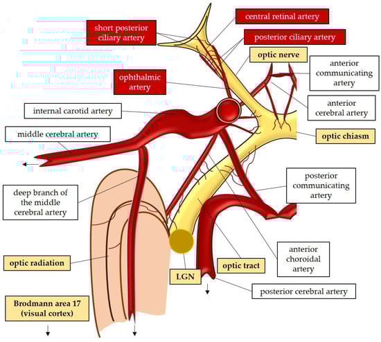 The large and small axons of the lateral geniculate nucleus form optic radiation, which initially projects anteriorly and then turns posteriorly, terminating in the occipital lobe where the visual cortex (Brodmann area 17) is located [47,59]. These regions receive blood supply from branches of the internal carotid artery (lateral geniculate nucleus and optic radiation) and the posterior cerebral artery (visual cortex) [52]. In Figure 2, the perfusion and the anatomy of the visual pathway are illustrated.