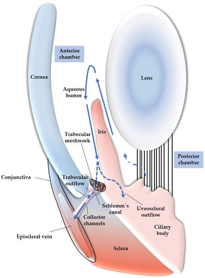 To gain a better understanding on the role of reactive species in glaucoma, it is important to discuss the anatomy and function of the TM and the detrimental impact of ROS on these structures. The TM is located in the sclerocorneal angle and consists of three layers: the uveal TM, the corneoscleral TM, and the juxtacanalicular TM, also known as the cribriform TM region. This region is adjacent to the Schlemm’s canal, which allows for the drainage of aqueous humor into the episcleral veins [201]. The TM plays a crucial role in regulating IOP by controlling the outflow of aqueous humor. It allows for the turnover of aqueous humor through drainage into superficial veins toward the conjunctiva [201]. Any alterations in TM permeability, such as changes in TM structure, can result in increased resistance to aqueous humor outflow, leading to elevated IOP. Studies focusing on TMCs have investigated how increased IOP may develop in glaucoma patients. These studies have shown that the oxidative balance in aqueous humor, which has been found to be altered in individuals with glaucoma [179,202], can impact the structure and function of TMCs, particularly the TM endothelial cells lining the Schlemm’s canal [203]. Elevated levels of ROS in the aqueous humor can trigger changes in the TM [162]. This can occur through the fusion of TMCs, leading to trabecular thickening [204]. Additionally, ROS can induce TMC apoptosis, resulting in TM disruption [203]. Alterations in the extracellular matrix (ECM) can also occur, affecting the adhesion of endothelial TMCs to the ECM and causing the TM to collapse [205]. In all of the cases, increased resistance to aqueous humor circulation occurs, leading to elevated IOP [203]. In Figure 4, an anatomical overview of the described organs, with focus on the anterior segment of the eye, is presented.
