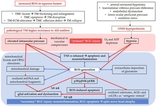 Oxidative damage contributes to axonal injuries, leading to the death of RGCs [37]. RGC loss may occur as a result of a process involving ROS, elevated IOP, mechanical compression on RGC axons, or vascular compression of optic-nerve-perfusing vessels [40]. Our previous research in mice has demonstrated that already moderately elevated IOP can impair vascular autoregulation and cause endothelial dysfunction in the retina, which is associated with an upregulation in NOX2 [140]. Additionally, high hydrostatic pressure and ischemia have been found to stimulate the release of tumor necrosis factor α (TNF-α) from glial cells, activating apoptotic signaling pathways in RGCs [206]. TNF-α released by active astrocytes, microglia, and Müller glial cells is one of the most significant proinflammatory cytokines in glial neuroinflammation, mitochondrial dysfunction, and oxidative stress [207]. Moreover, TNF-α can induce apoptosis through caspase-8 activation [207]. Mitochondrial dysfunction also plays a pivotal role in glaucomatous optic disorders. Increased IOP has been shown to damage mitochondria, leading to mitochondrial fission and alterations in the expression of the OPA1 gene [208,209]. Via ROS-induced activation of the transcription factor nuclear factor “kappa-light-chain-enhancer” of activated B-cells (NF-kB), mitochondria indirectly contribute to the initiation or amplification of glial neuroinflammation processes [208], resulting in the production of inflammatory cytokines. Furthermore, oxidized mitochondrial DNA and mitochondrial fragments released from microglia can activate inflammasomes [208]. Oxidative stress also disrupts the glutamate/glutamine metabolism, leading to the neurotoxic extracellular accumulation of glutamate [40]. Glutamate is released from dying RGCs and activated glia, and the dysfunctional glial cells are unable to adequately buffer excessive extracellular glutamate [40,210,211]. Additionally, oxidized substrates, such as advanced glycation end products (AGEs) and oxidized low density lipoproteins (oxLDLs) can act as “antigenic stimuli”, inducing ROS production, triggering NF-kB activation, glial activation, neuroinflammation, and apoptosis [40,208]. In this context, the overproduction of ROS activates the apoptosis signal-regulating kinase 1 (ASK-1) [212,213], which, in turn, activates the p38/c-Jun N-terminal kinase (JNK)/extracellular signal-regulated kinase (ERK) axis. This axis triggers the mitochondrial apoptotic pathway, characterized by the release of the Bcl-2-associated X-protein (Bax) and cytochrome c into the cytosol, followed by apoptosome formation (cytochrome c/apoptotic protease-activating factor 1(Apaf-1)/caspase-9), ultimately leading to caspase-3 activation [212,214,215]. Moreover, hydrogen peroxide has been described to activate the phosphoinositide 3-kinase (PI3K)/Ak strain transforming (Akt) axis and reduce the intracellular concentration of the mammalian target of rapamycin (mTor), promoting NF-kB activation [216].