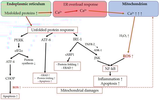 Figure 6. Role of calcium and reactive oxygen species in the interplay between ER and mitochondria. ER: endoplasmic reticulum; PERK: protein kinase RNA-like ER kinase; ATF: activating transcription factor; IRE-1: inositol-requiring protein 1; CHOP: CCAAT-enhancer-binding protein homologous protein; eIF2α: eukaryotic initiation factor 2α; sXBP1: spliced X-box binding protein-1; TNFR-2: tumor necrosis factor alpha receptor 2; ASK-1: apoptosis signal-regulating kinase 1; JNK: c-Jun N-terminal kinase; ERAD: ER-associated degradation; NF-kB: nuclear factor “kappa-light-chain-enhancer” of activated B-cells. Up arrows mean increase or upregulation. Down arrows mean decrease.