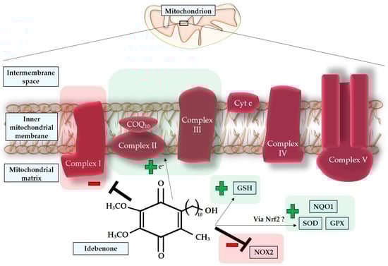 Figure 7. Direct and indirect effect of idebenone on the mitochondrial oxidative metabolism. COQ10: cofactor Q 10; Cyt c: cytochrome c; GSH: glutathione; SOD: superoxide dismutase; GPX: glutathione peroxidase; NQO1: NAD(P)H quinone oxidoreductase 1; NOX2: nicotinamide adenine dinucleotide phosphate oxidase 2; Nrf2: nuclear factor erythroid-derived 2-related factor 2.