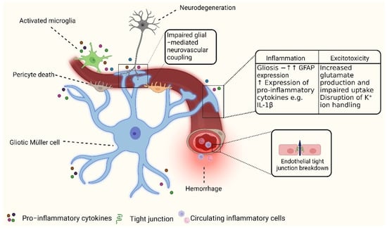 Diabetes causes the breakdown of the inner BRB through the secretion of various substances by glial and immune cells within the NVU, including VEGF, pro-inflammatory cytokines (such as interleukin-1 beta [IL-1β], tumor necrosis factor-alpha [TNF-α], interleukin-6 [IL-6], and monocyte chemoattractant protein-1 [MCP-1]), as well as components of the complement system [20]. The dysregulation of the NVU not only leads to heightened vascular leakage but also disrupts blood flow regulation and causes the thickening of vascular basement membranes. The thickening of these membranes interferes with intercellular communication, affecting survival signaling between the vascular component cells and their interaction with other perivascular elements of the retinal NVU (as reviewed by [1,2]).